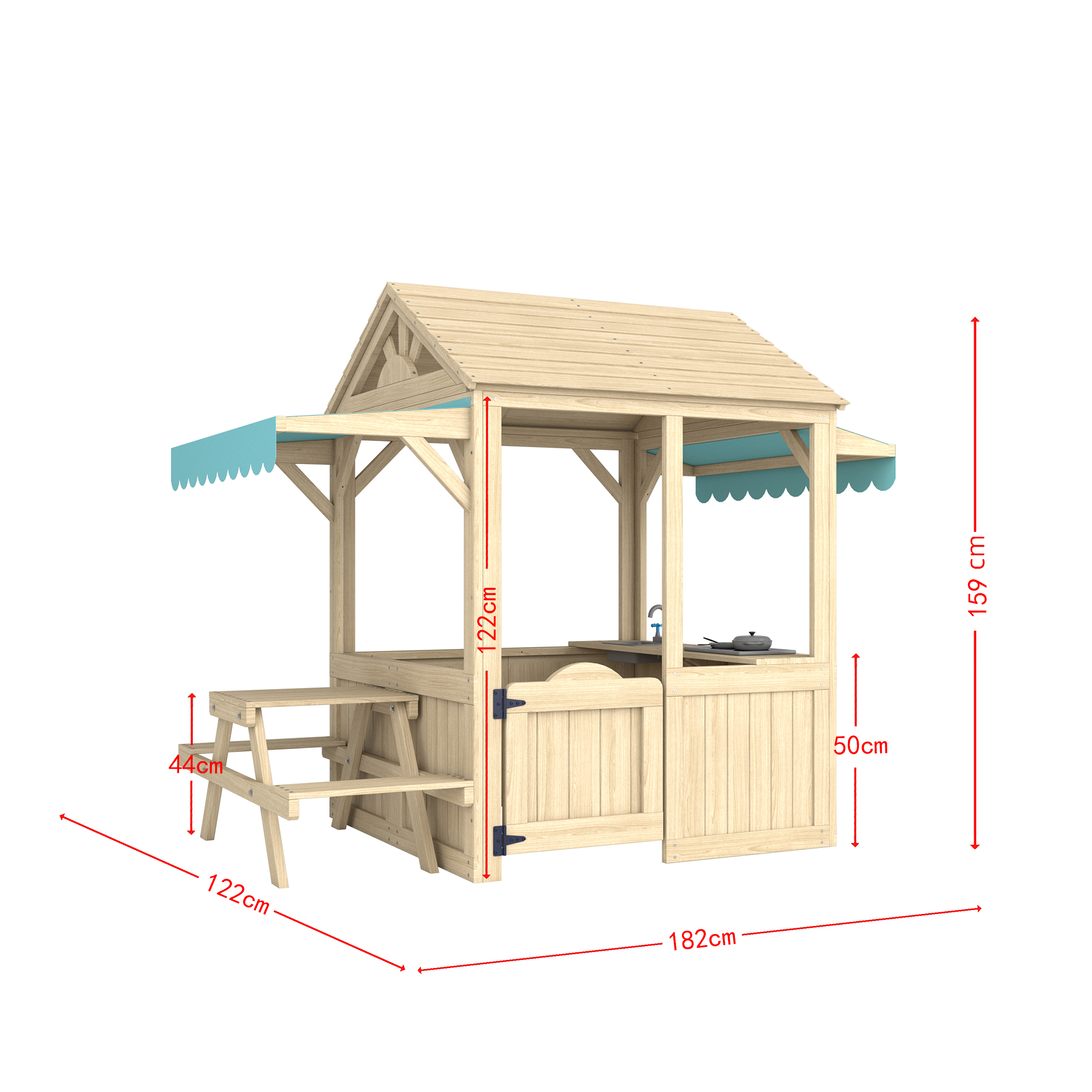 Дървената игрална къща на тази детска къща от Wideway е изработена от първокласна ела, гарантираща екологичност, сила и издръжливост. Измервайки 182 × 122 × 159 см, структурата осигурява достатъчно пространство за въображаема игра, като същевременно гарантира безопасност. Playhouse разполага с работна маса с малка мивка, заедно със странична маса и пейка, идеална за ролеви игри и групови дейности. Покритият покрив с цветни тъкани нюанси добавя както чар, така и функционалност, което го прави подходящ за употреба на открито. Всеки детайл е внимателно полиран за гладки ръбове, защитавайки децата по време на игра. Идеален за задните дворове или детски градини, тази игрална къща създава забавна и безопасна среда. С години опит в детските продукти на открито, Wideway гарантира надеждно качество, надеждно от клиентите по целия свят.